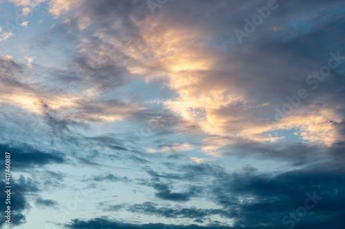 Obraz premium White translucent feathery clouds, reflections warm rays setting sun. Bright...