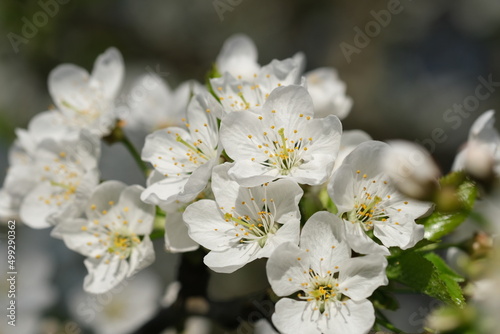 © oksanatukane, Fototapeta premium White tree blossom close up selective focus. Blurred background with copy space. floral background