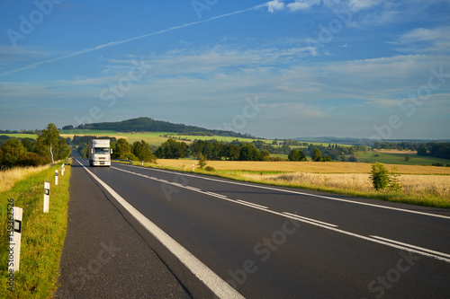 © am, Fototapeta premium White truck arriving from a distance on the asphalt road between agricultural fields in a rural landscape