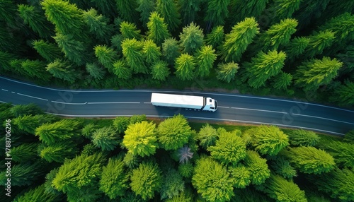 © Vadym, Naklejka premium White truck drives on asphalt road through lush green forest. Aerial view shows modern transport on path between dense trees. Eco friendly logistics, sustainable journey, freight service.