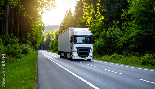 © Muhammad, Obraz premium White Truck on Forest Road.