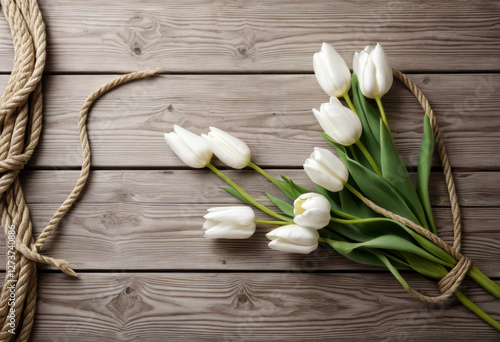 Naklejka premium White tulips and ropes were placed on the wooden table