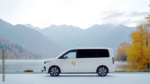 © KUTIL KURO, Fototapeta premium White van by a lake, autumn scenery