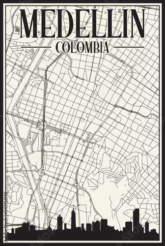 Fototapeta premium White vintage hand-drawn printout streets network map of the downtown MEDELLIN, COLOMBIA with highlighted city skyline and lettering