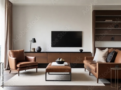 © Hendry, Fototapeta premium White wall mounted tv on cabinet in living room with leather sofa and minimal design