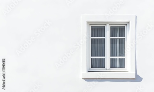 Fototapeta premium White wall, single white-framed window, sheer curtains.
