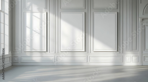 © embun, Fototapeta premium White Wall with Classic Molding and Sunlight - 3D Illustration