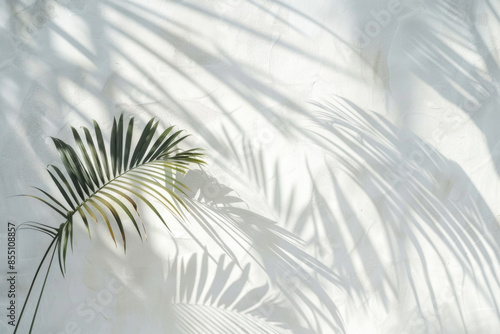 © Jasmina, Obraz premium White wall with tropical palm leaf shadow. Beautiful abstract background concept banner for summer vacation