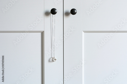 © Evelien, Obraz premium White wardrobe doors with a hanging necklace with silver heart pendant. Minimalistic style.
