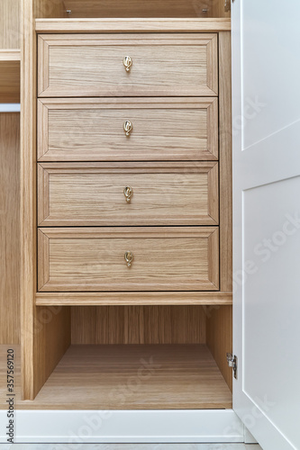 © timltv, Fototapeta premium White wardrobe with wooden drawers and shelves. Wooden filling of wardrobe