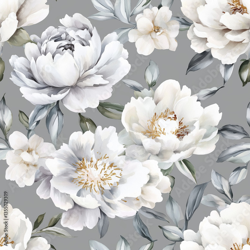© Olivia, Obraz premium White watercolor wedding peonies on grey background Wallpaper, seamless pattern