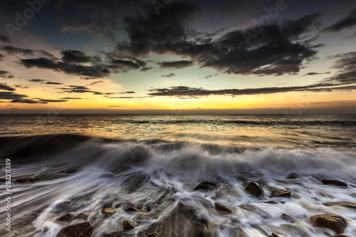 © Daniel Dawn, Fototapeta premium White waves crashing on the rocks at sunset
