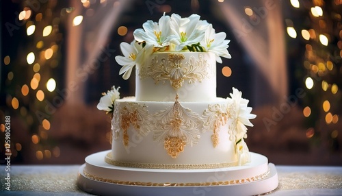 Fototapeta premium White wedding cake with flowers luxury beautiful modern decorations for bride, love
