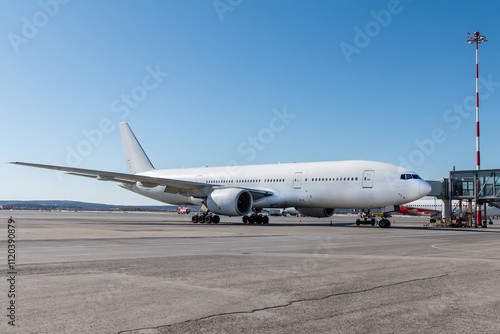© Dushlik, Fototapeta premium White wide body passenger jet plane at the gateway on the airport