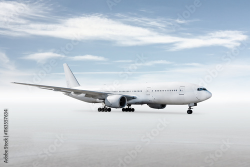 © Dushlik, Obraz premium White wide body passenger jetliner isolated on bright background with sky