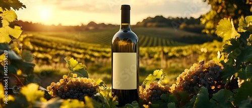 © Mach-1-Art, Fototapeta premium White wine bottle in a scenic vineyard setting