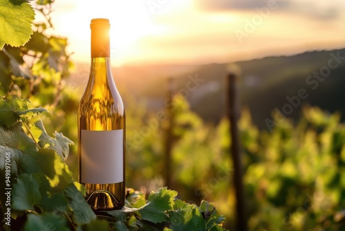 © stock.metket.com, Fototapeta premium White wine bottle mock up on on top of an old barrel, rows of barrels inside a winery