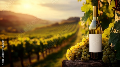 © Masque, Fototapeta premium White wine bottle mock-up set in a sunny vineyard landscape.