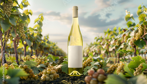 © Oleksiy, Fototapeta premium White wine bottle mock-up set in a vineyard landscape, highlighting the connection between wine and its natural origins