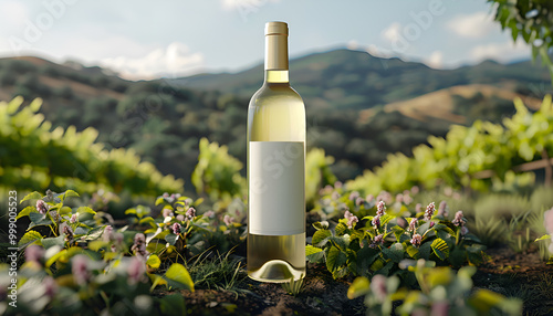 © Oleksiy, Fototapeta premium White wine bottle mock-up set in a vineyard landscape, highlighting the connection between wine and its natural origins
