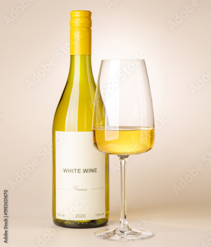 © evgeeenius, Fototapeta premium White wine bottle mockup with glass