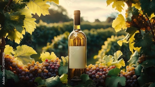 © Donna, Fototapeta premium White Wine Bottle Surrounded by Grape Leaves in Vineyard Landscape with Rolling Hills and Golden Hour Lighting
