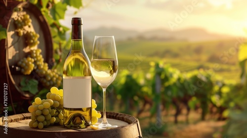 Fototapeta premium White wine glass and grape on wooden barrel with vineyard background