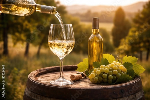 © vxnaghiyev, Fototapeta premium White wine poured in glass set on rustic barrel in tranquil rural location