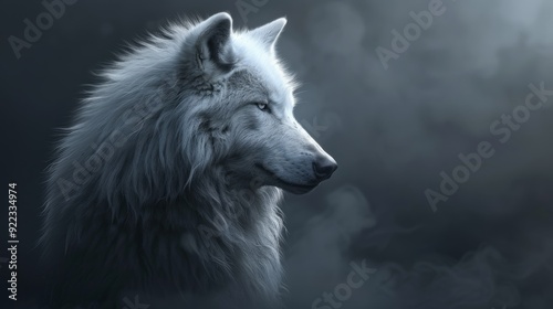 Obraz premium White wolf gracefully stands in misty forest at twilight, embodying serene...