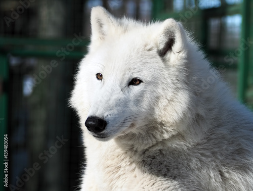 Fototapeta premium White wolf laying at the snow close-up