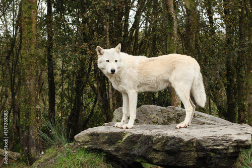 Fototapeta premium white wolf standing on a rock, woodland behind