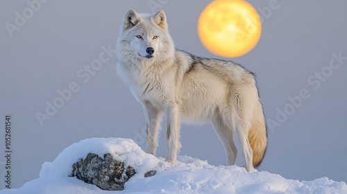 © Muamanah, Obraz premium White wolf standing on a snowy hill with a large orange sun in the background