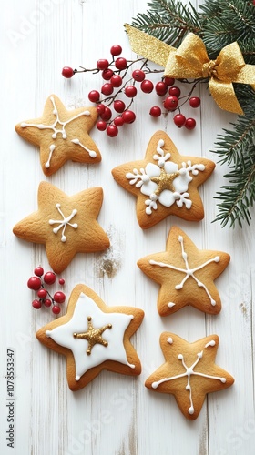 Fototapeta premium White wooden background with Christmas decorations, featuring gingerbread star cookies, red berries, pine branches, and golden bows, creating a festive and cozy setting.