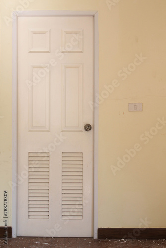 © noomcm, Fototapeta premium White wooden bathroom door with louver on concrete wall.