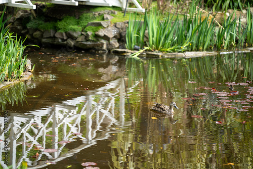 Fototapeta premium white wooden bridge over a pond in a botanical garden in australia