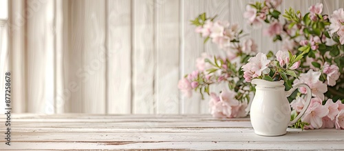 © vxnaghiyev, Fototapeta premium White wooden table with a dainty jug of cream beside rose rhododendron flowers in a high key setting creating a backdrop with ample copy space image