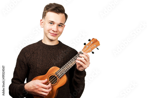 © vika33, Obraz premium White young guy in sweater play on ukulele in his hands. Isolated on a white background.