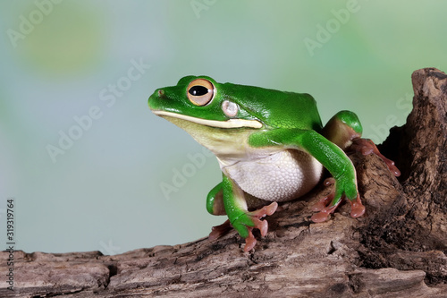 © kuritafsheen, Obraz premium Whitelipped frog sitting on wood looking around and ready to jump
