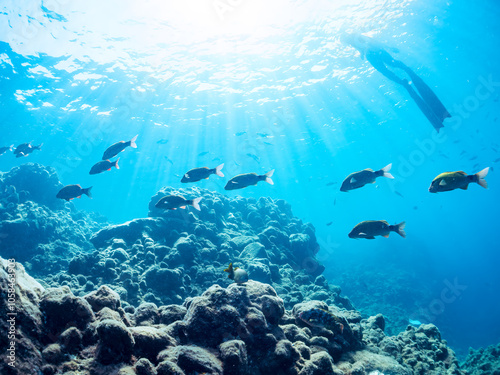 © d3_plus, Fototapeta premium 逆光の美しいホウライヒメジ(ヒメジ科)の他群れと水面を泳ぐスキンダイバー。 英名学名:Whitesaddle goatfish (Parupeneus ciliatus) 静岡県伊豆半島賀茂郡南伊豆町中木ヒリゾ浜2024年