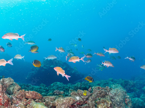 Naklejka premium 美しいホウライヒメジ(ヒメジ科)、チョウチョウウオ(チョウチョウウオ科)、ヘラヤガラ(ヘラヤガラ科)の他群れ。...