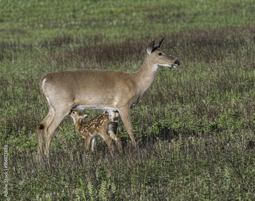 Obraz premium Whitetail doe and young fawn in a meadow.