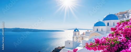 © narak0rn, Naklejka premium Whitewashed Greek island architecture with blue domes and blooming pink flowers against a bright blue sky and sparkling sea.