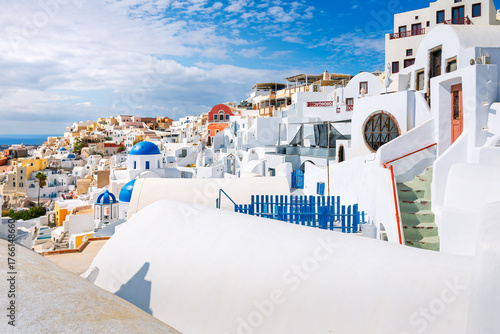 Obraz premium Whitewashed terraces and blue dome churches highlight the colorful townscape...