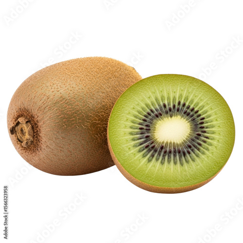 Obraz premium Whole and half kiwi fruit with vibrant green flesh and black seeds isolated on transparent background