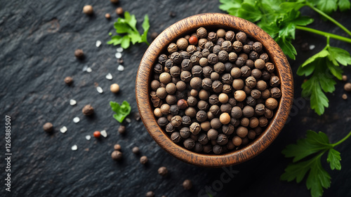© ceren, Fototapeta premium Whole Black Peppercorns in Rustic Wooden Bowl