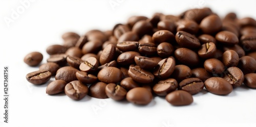 © intothestar, Naklejka premium Whole coffee beans in a pile, isolated on white, seed, macro, caffeinated