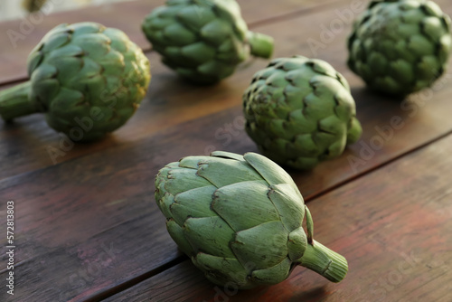Fototapeta premium Whole fresh raw artichokes on wooden table, closeup