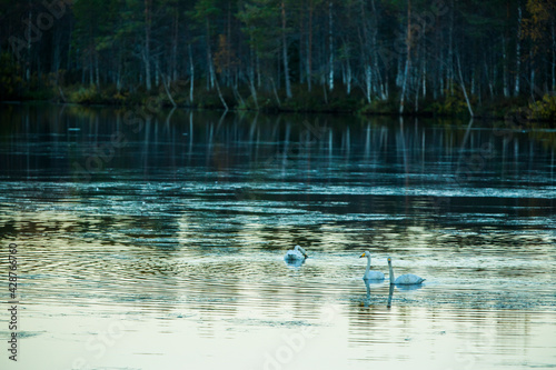 Fototapeta premium Whooper swan group in a lake in Lapland, Finland