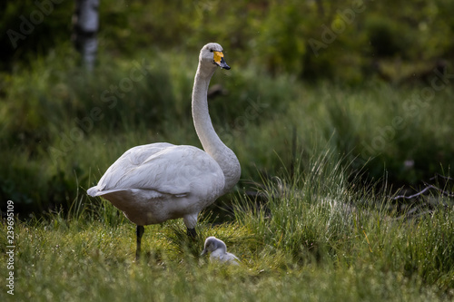 Obraz premium Whooper swan with chick at a pond