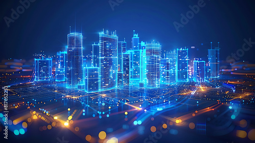 © MDShah, Fototapeta premium Wi-Fi smart city or network. Low poly wireframe. Building Automation with Computer Board Illustration. Wireless smart city or network